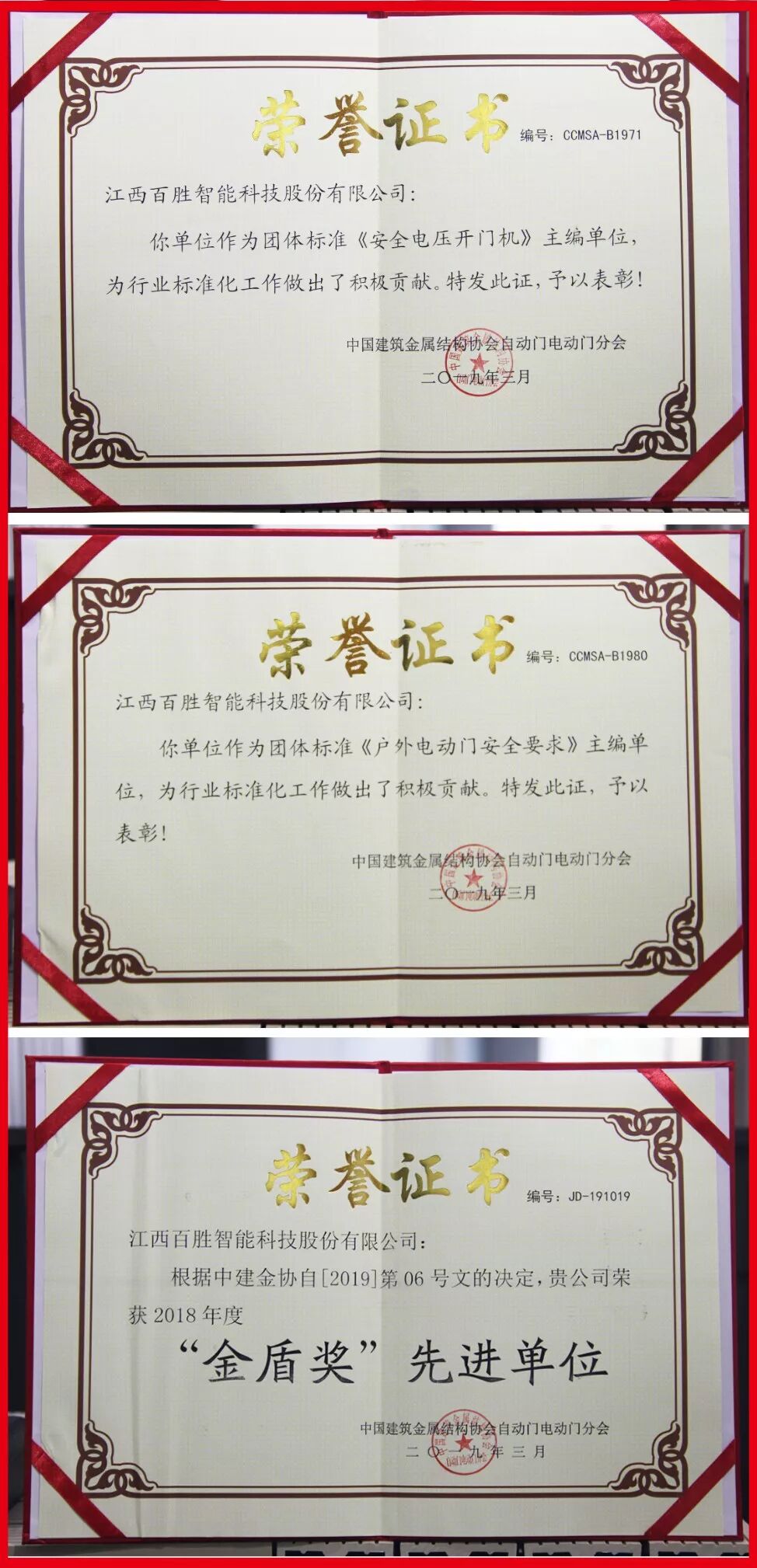 《安全电压开门机》团体标准主编单位、《户外电动门安全要求》团体标准主编单位、2018年度全国自动门电动门行业金盾奖。